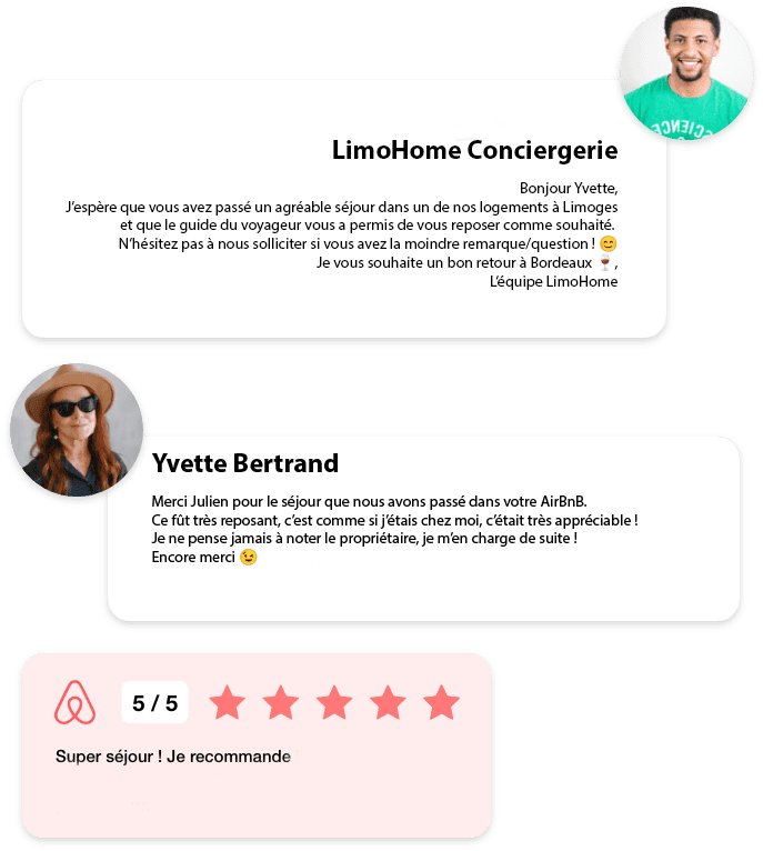 Maximisez vos revenus locatifs avec LimoHome Concierge. Nous prenons en charge l’accueil des voyageurs, le ménage et l’entretien de votre logement à Limoges, Saint-Junien, Feytiat, Nexon et Brive-la-Gaillarde . Offrez une expérience haut de gamme à vos invités sans effort !